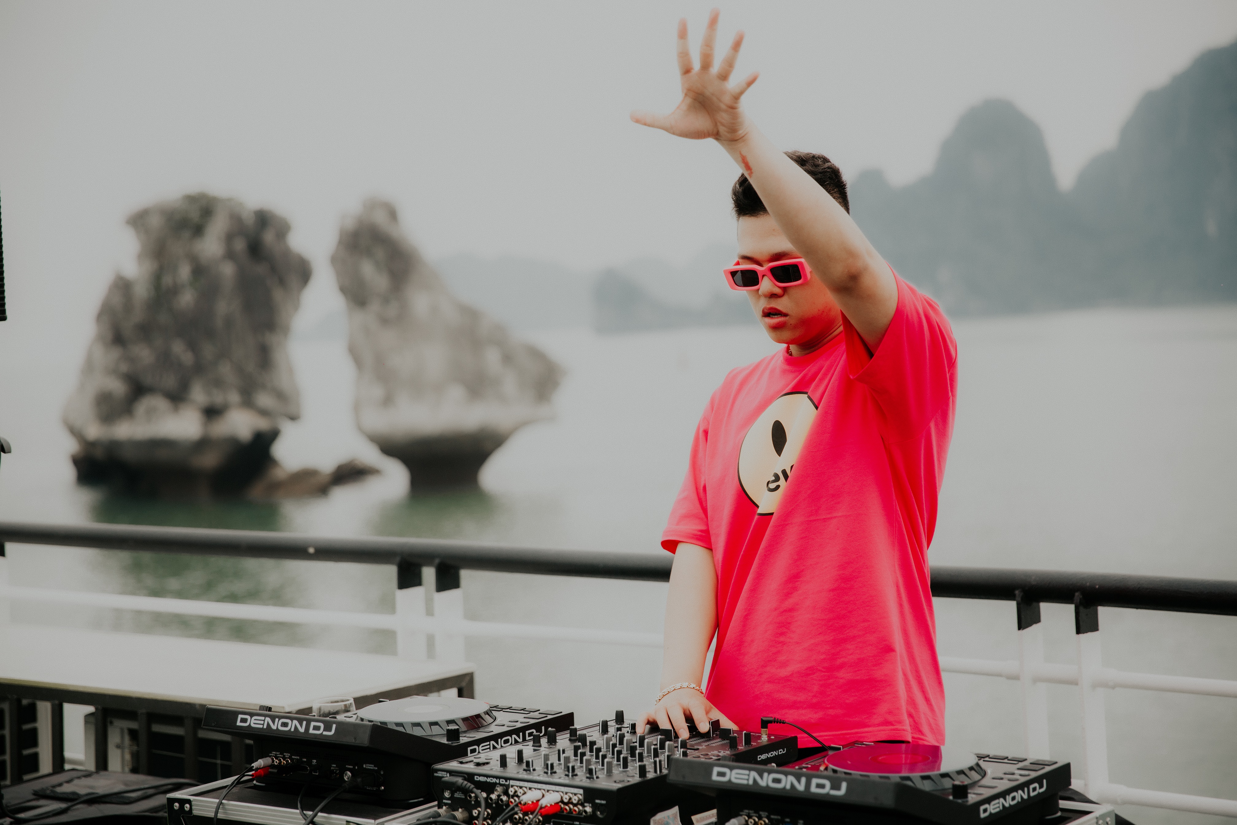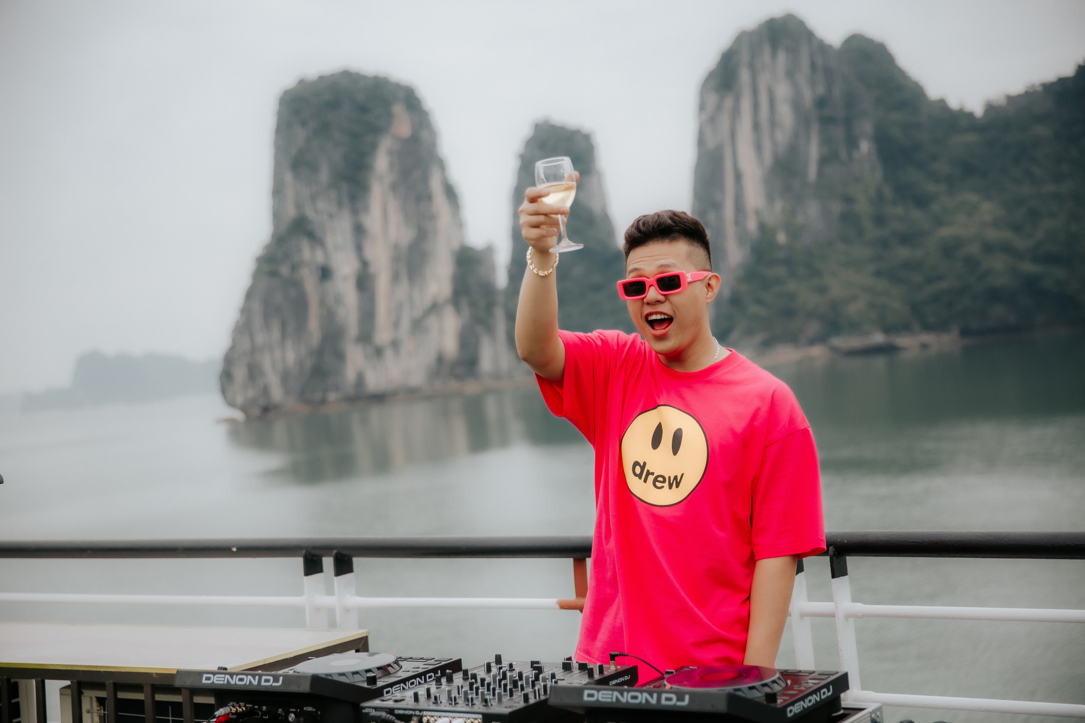 Về phần đội ngũ Denon DJ Vietnam, chúng mình đã từng hợp tác với rất nhiều nghệ sĩ lớn nhỏ trong và ngoài nước, và mỗi lần đều có những trải nghiệm khác nhau. Đoàn của mình lên xe và di chuyển từ Hà Nội đến Hạ Long từ sáng sớm và đến nơi vào khoảng 10h30. Nghỉ ngơi và ăn trưa một chút rồi di chuyển lên tàu sau đó. Set up thiết bị, kiểm tra âm thanh, dựng góc máy quay,… và thuyền bắt đầu nhổ neo vào khoảng 13 giờ chiều. Đây cũng là một ngày khá đặc biệt vì trùng với ngày sinh nhật của Tilô nên cả đoàn đã có một chút tiệc nhẹ nhằm chúc mừng ngày này.